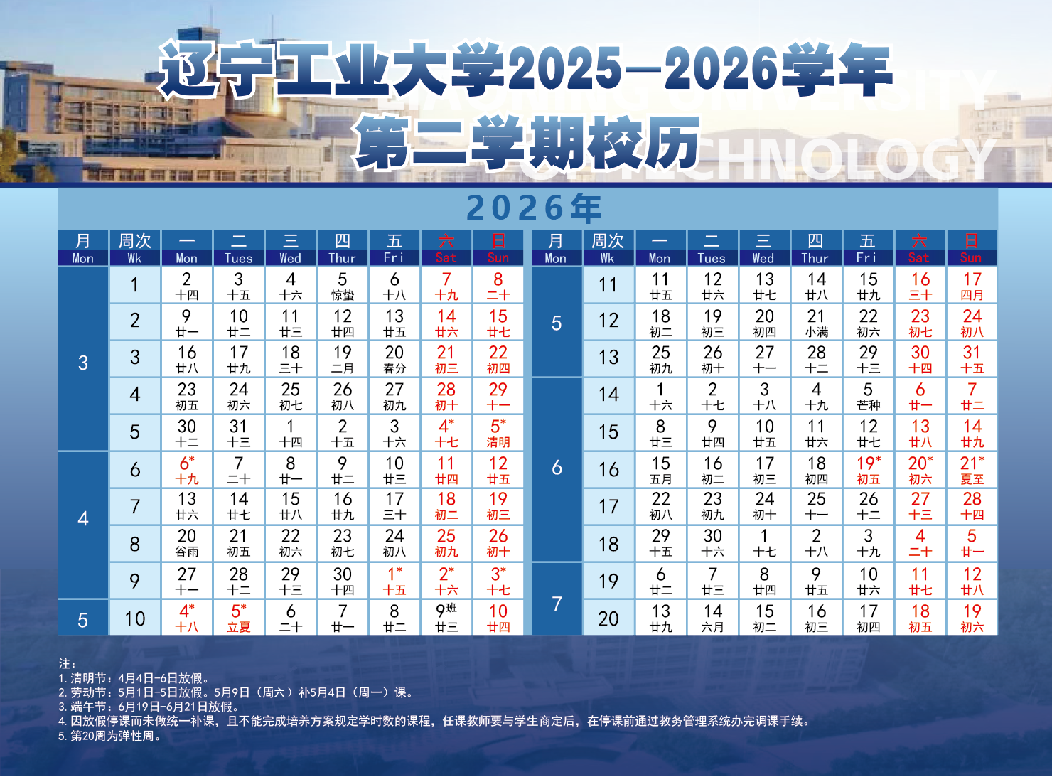 辽宁工业大学2025-2026学年第二学期校历